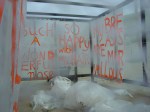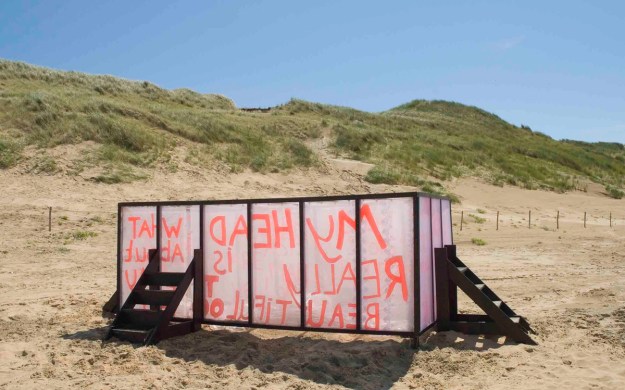 Her work on the beach is titled ‘Love Me’. We see parts of a woman’s body – pathetic, repulsive, grotesque, laughable – in a kind of gauze display case. Or is it a cradle, or a deathbed? Pieces of lace hang against the gauze with texts written in a cheerfully childlike hand. They seem to be diary fragments, or scribbles from a notebook. They sound almost as imploring or begging as the title. “Look at my hands so beautiful”; “My breasts are marvellous”. But everyone can see what the hands and breasts actually look like by climbing the inviting steps. Compared with this person, everyone is beautiful.