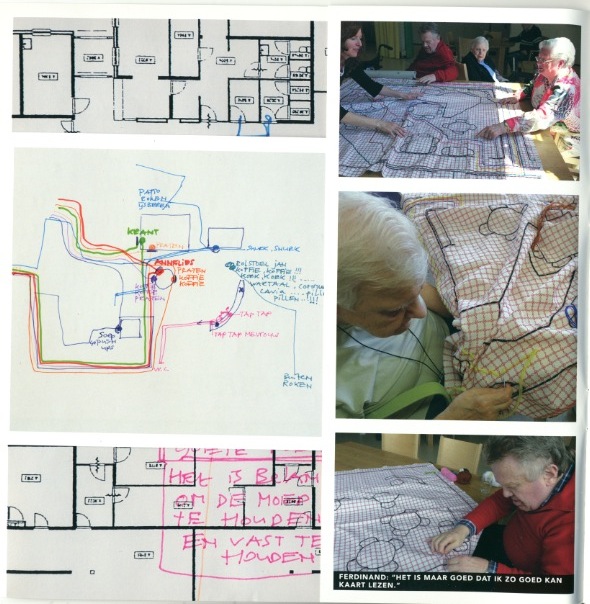 My point of departure was that in this group the combination of their age and their clinical syndrome would create a bigger need for stability than in other people, and therefore, their established patterns would be anchored more solidly. The fact that the environment of this specific group gets smaller and smaller, means that they are usually less stimulated to move around. This is why I wanted to investigate, together with these people, if and how I could make them more aware of their routes and routines. I wanted to know how I could invite them to walk different paths, and I was curious how they would then look at their environment with fresh eyes and which position they would take up in it. The process generated conversations and new experiences. It became clear how, why and who held on to which patterns.