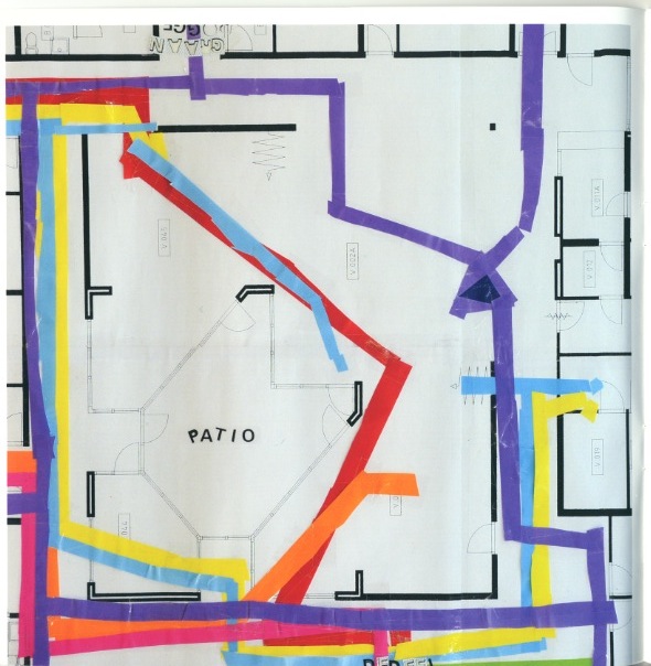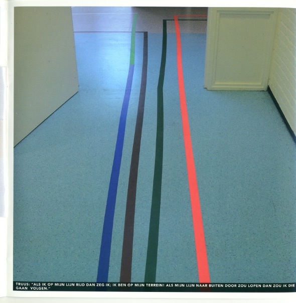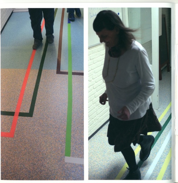 During spring 2012, Joanneke Meester was at work at The Fifth Season. This artists’ residence, situated on the grounds of Altrecht Mental Health Institution in Den Dolder, is occupied every three months by a different artist. Together with the patients of the institute, the artists work on a project, resulting in inspiring and fascinating images about psychiatry. One of the goals of The Fifth Season is to bring society closer to the patients and vice versa.For her project Routes and Routines, Joanneke Meester worked with a group of elderly psychiatric patients. The relationship between movement and mental well-being on one side, and her assumption that a long term stay at a mental health institution makes people less mobile on the other, formed the backbone of this project. In the course of three months, an extensive plan unfolded in which patients aged 65 and older mapped their movements and were challenged to take different paths.Questions that interested Joanneke Meester were, for instance: “Why do we hold on to routines so often in our daily life? And what happens if we break through our ingrained patterns?”The artist was particularly involved with the elderly people of Altrecht’s Korenveld department. In a short period of time, she established a special bond with the group and became a welcome guest of the department. The project stimulated the patients’ curiosity to observe their own movements and those of others.The elderly patients mapped their movements in a number of ways. They embroidered their routes from their own department to the central hall and its surroundings, each using his or her own colour to identify their own path. Subsequently, collages were made and the various routes were taped to the ground in coloured lines. The process resulted in a cheerful collection of mapped patterns.