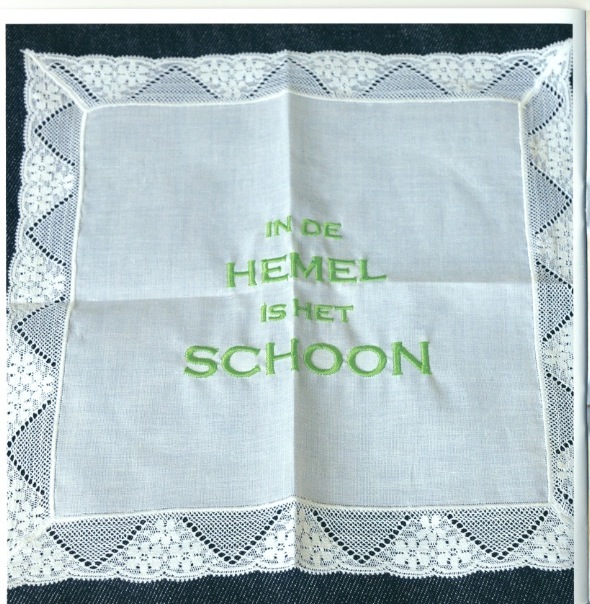 The patterns of movement of the elderly people were very diverse in comparison, and they were often related to their clinical syndrome. For instance, there were patients who, out of fear, avoided large spaces or patients who always followed the same route compulsively. While working together with the patients, I discovered that some patients had the desire to die and that often this was still a taboo for the patients themselves, for their family, and sometimes even for the personnel. I asked the patients what they would wish for someone who doesn’t want to continue living, in order to give him or her strength. In the end, a lady for whom this is an issue said; ‘It’s clean in heaven’. In my opinion, this sentence gives room for acceptance. Both for the patient and for his or her surroundings. It’s a statement that offers comfort. For this reason, I had it embroidered on a handkerchief.