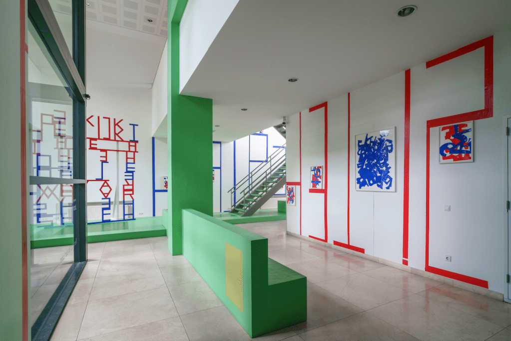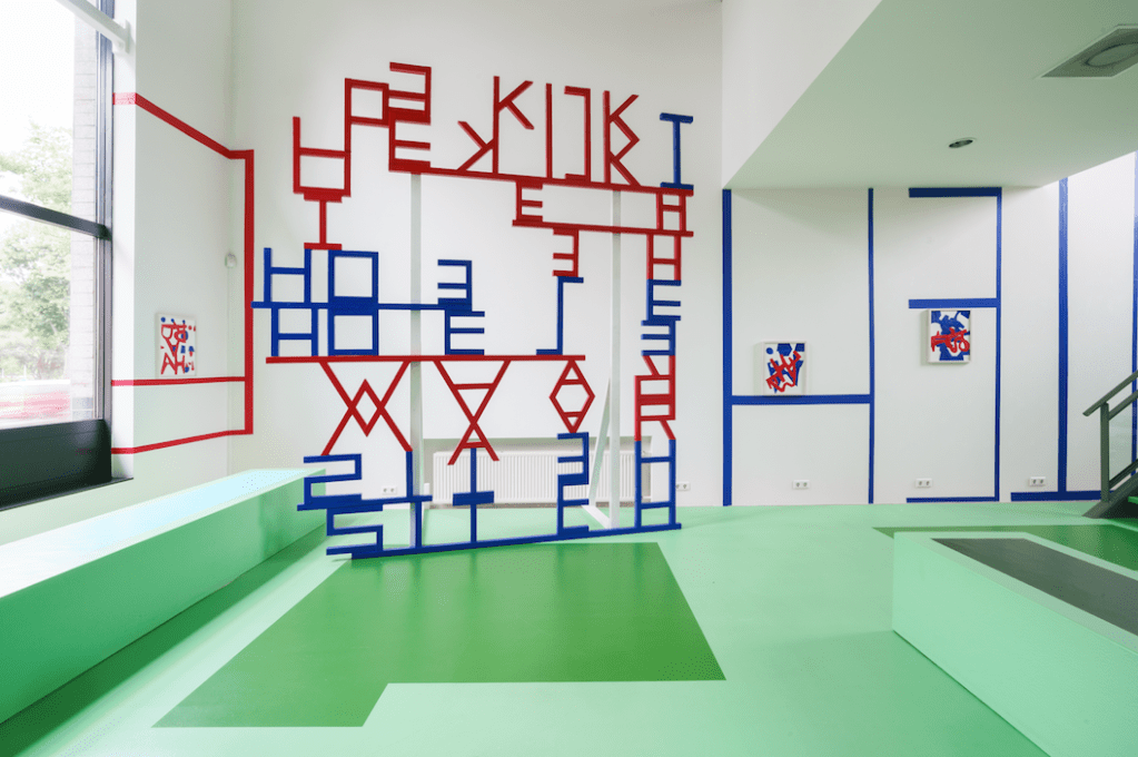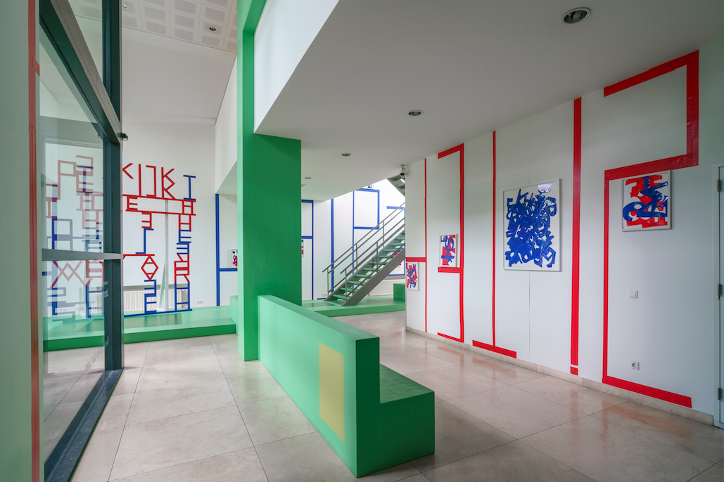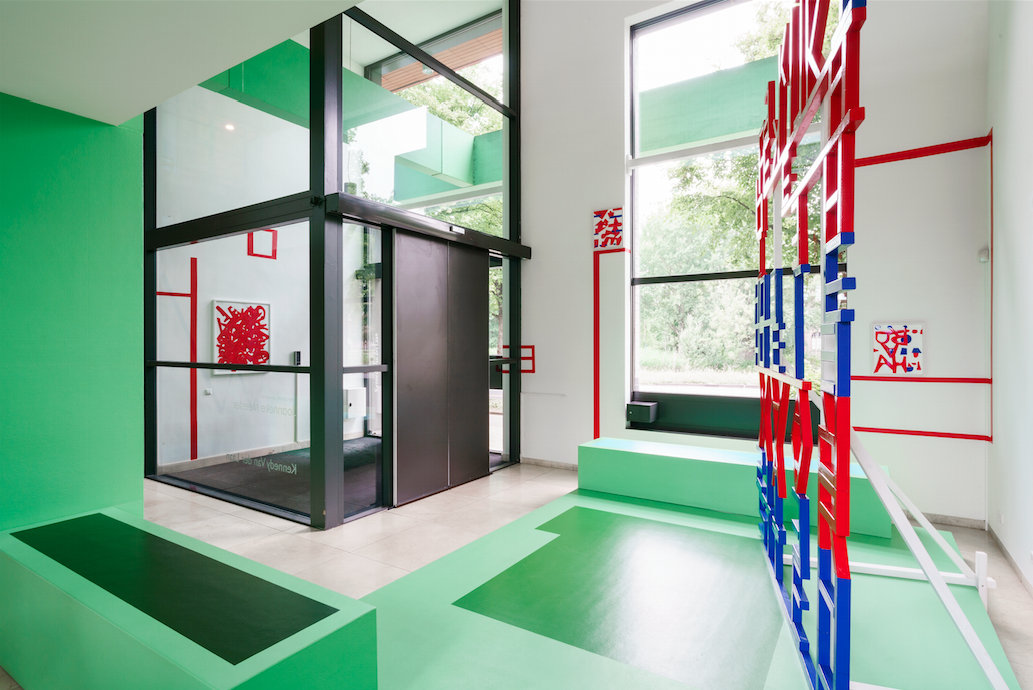 A site-specific work specially developed for the law firm Kennedy Van der Laan. Red and blue mirrored letters form a sculpture that—both spatially and conceptually—is supported by wall tape, tags, and collages.