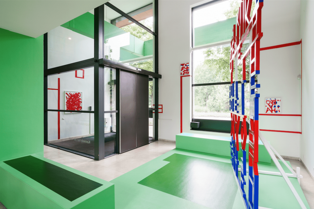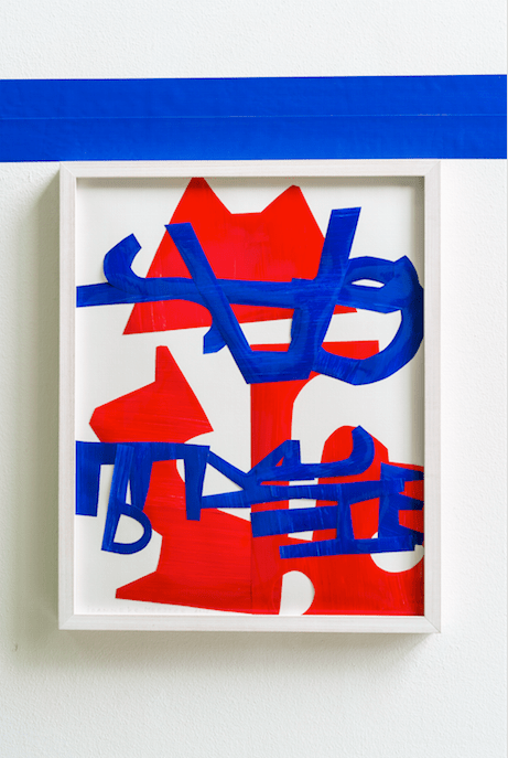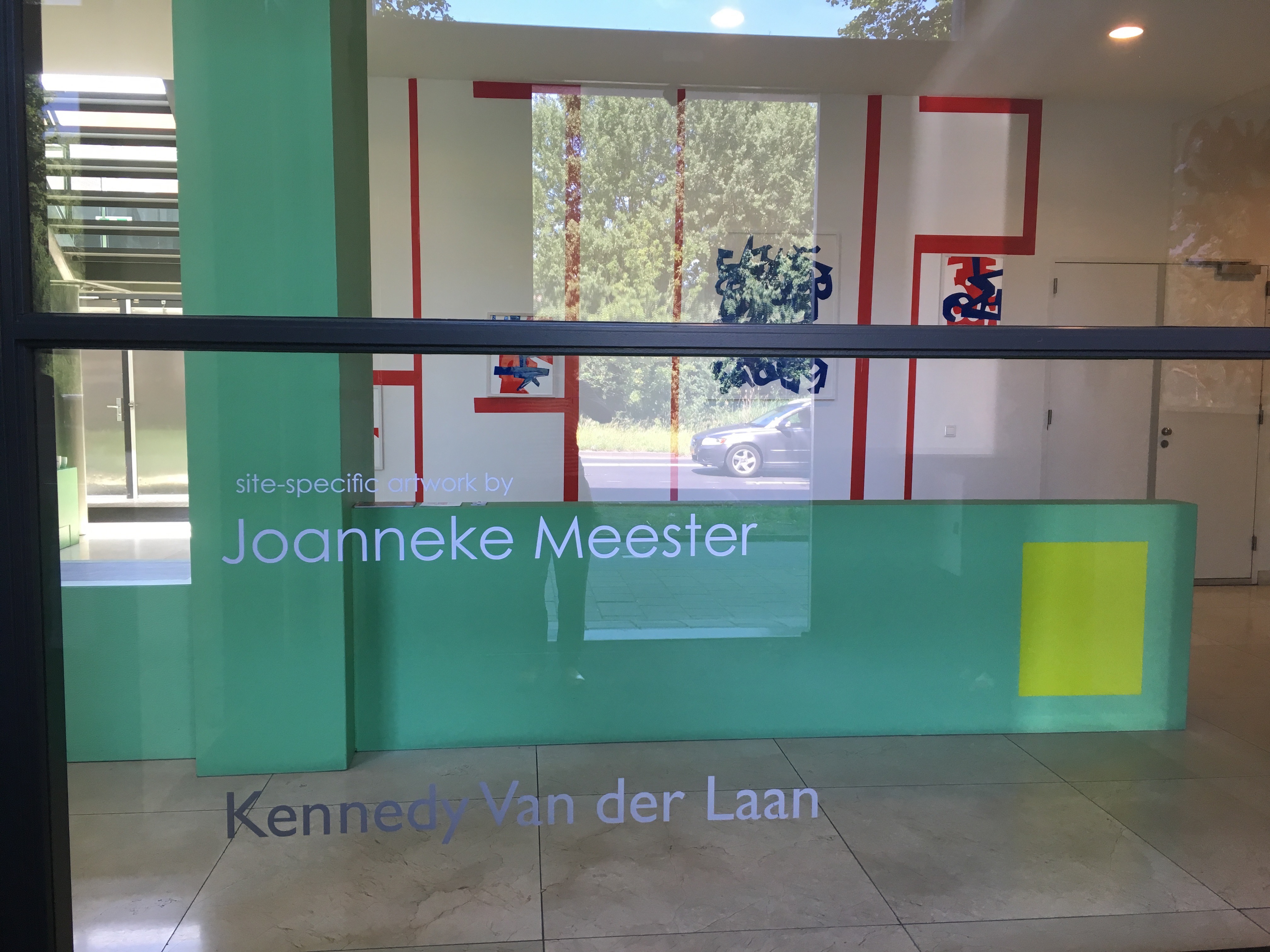 Het is maar hoe je het bekijkt, bekijk het maar een site-specific werk speciaal ontwikkeld voor Kennedy van der Laan advocaten kantoor. Rood, blauw en in spiegelbeeld verwerkte letters vormen een sculptuur dat – zowel ruimtelijk als inhoudelijk – wordt gestut door muur- tape, tags en collages.