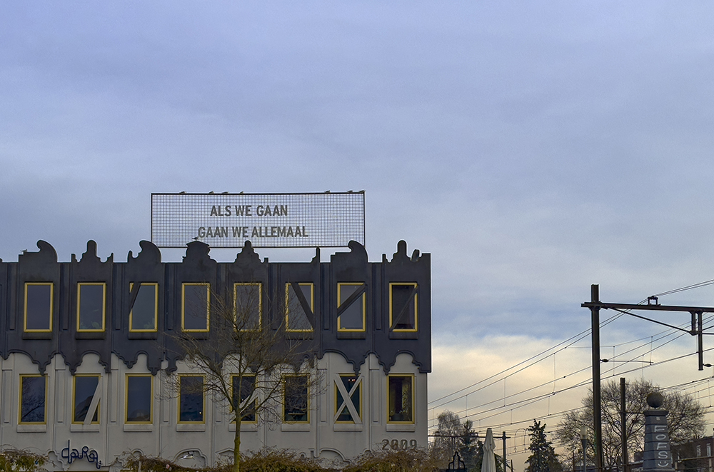 For the project Tekstisoppermachtig.nl, I contributed the phrase “If we go, we all go.”, displayed on the rooftop of Dara in Amersfoort.
