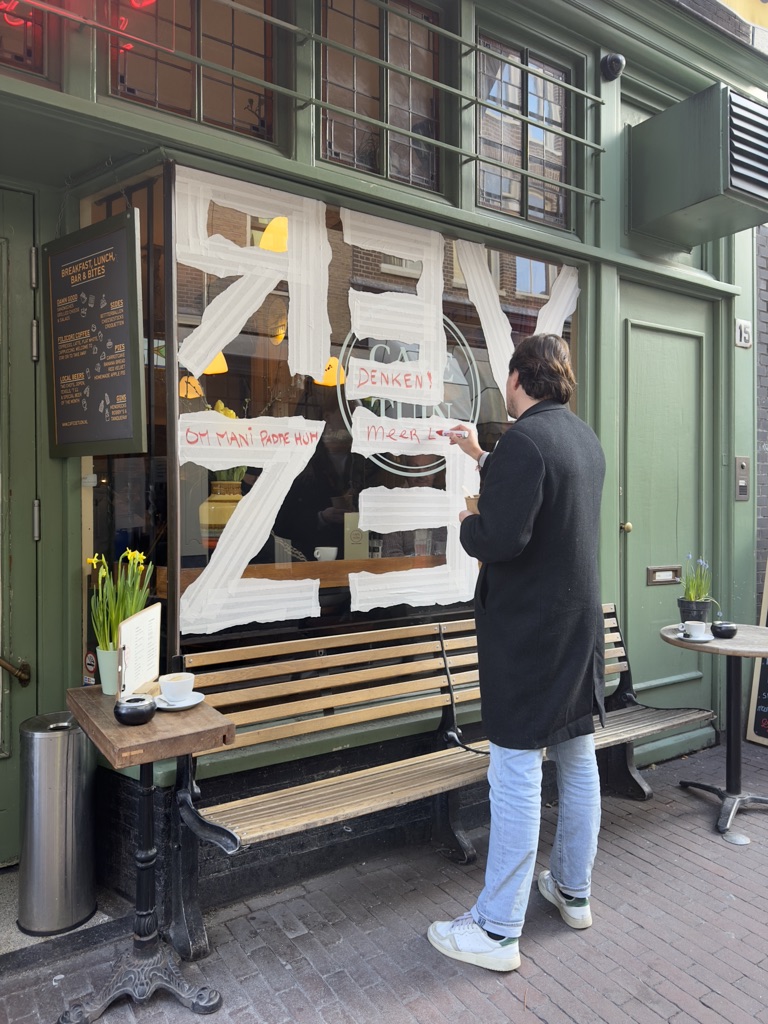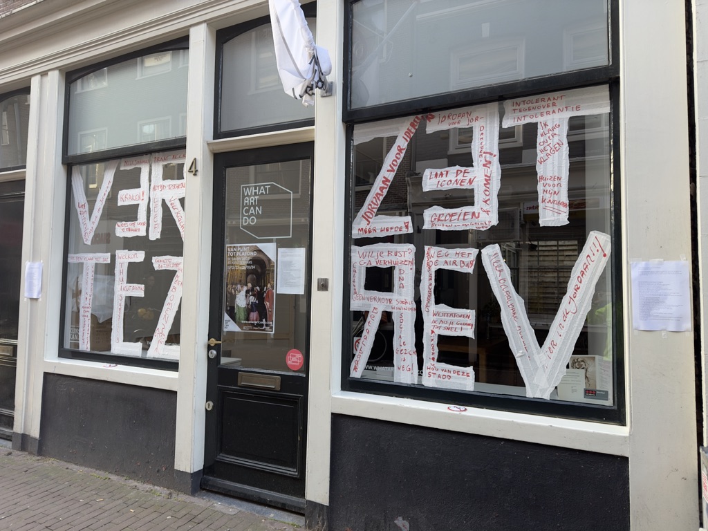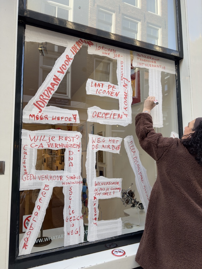 The text installation RESIST RESIST is my reflection on the complaints of residents from the Jordaan neighborhood in Amsterdam. The text is repeated on the windows of three buildings on Tweede Tuindwarsstraat. The public could leave responses on the letters. This interactive artwork serves as a tool, making it possible to resist resistance in a personal way.