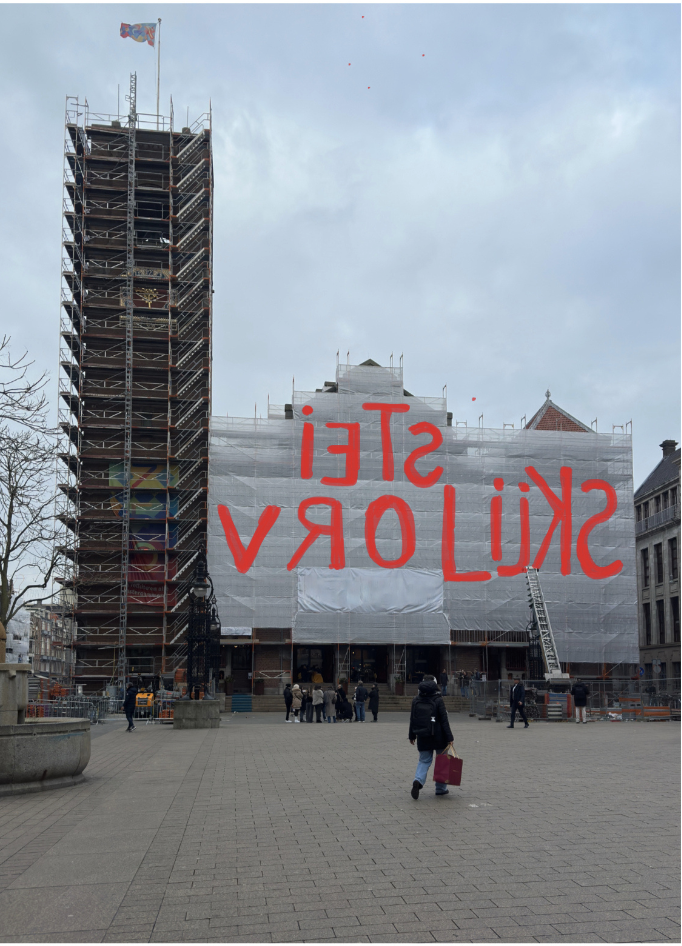 De woorden ‘Iets Vrolijks’ vormen samen een grafisch beeld. Door het spiegelen van enkele letters wordt de leesbaarheid vertraagd; het publiek wordt uitgenodigd om stil te staan en actief te kijken.